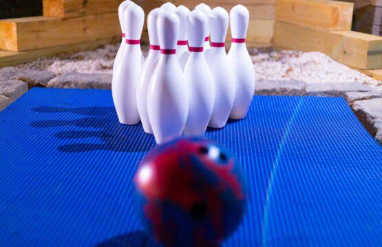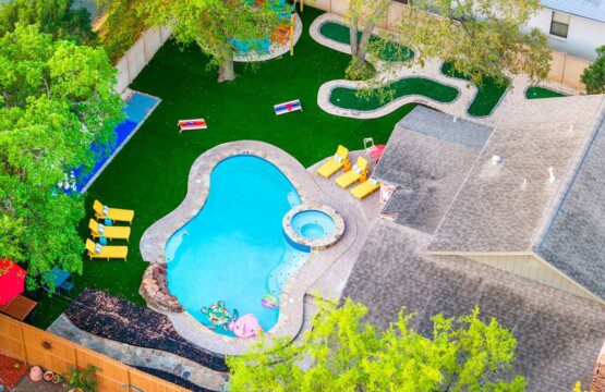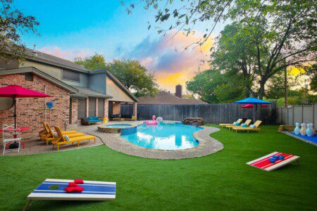 – Backyard mini-golf, bowling, and a fire pit under twinkling lights