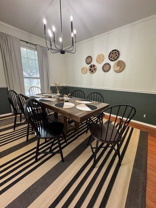 Are you a master of the kitchen? This fully-equipped kitchen has everything for your cooking adventures. Generously stocked with a spice rack, baking sheets, pots & pans galore – plus necessary tools like blenders, crockpots and a toaster – there won’t be an ingredient or technique left unperfected in any dish. Afterwards, savor special meals in our spacious dining room seating up 8 lucky guests while overlooking your backyard oasis! Additional seating for 7 between the kitchen table and island. Or dine alfresco and soak in your outdoor paradise, complete with dining space and lounge area.